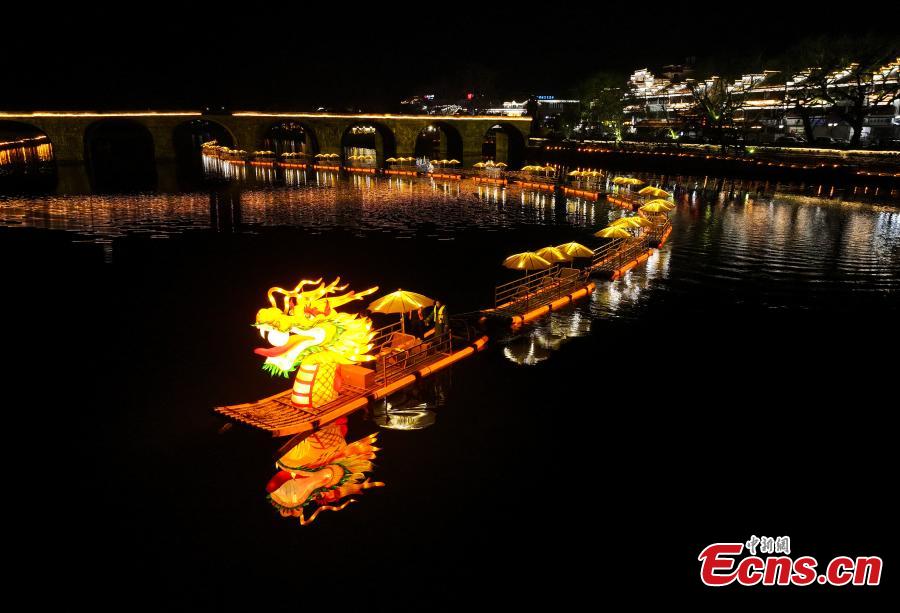 A 200-meter-long fleet of lit-up boats with a dragon head rafting along Hengjiang River at night adds a festive atmosphere in Huangshan, east China's Anhui Province, Jan. 27, 2024. (Photo: China News Service/Shi Yalei)