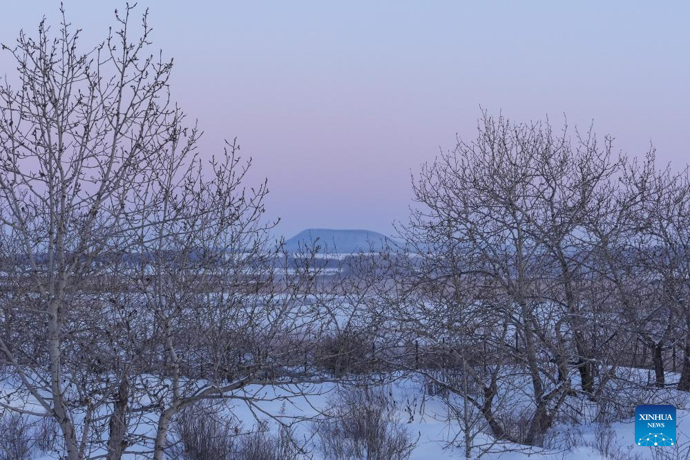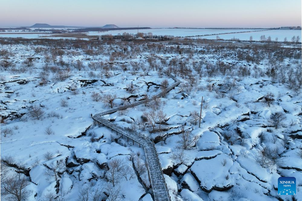 This photo taken on Jan. 29, 2024 shows a view of the Wudalianchi Geopark in Heihe, northeast China's Heilongjiang Province. The Wudalianchi Geopark features 14 volcanoes and five major volcanic barrier lakes. The geopark boasts a complete set of volcanic landforms, making it a natural volcano museum. (Xinhua/Xie Jianfei)