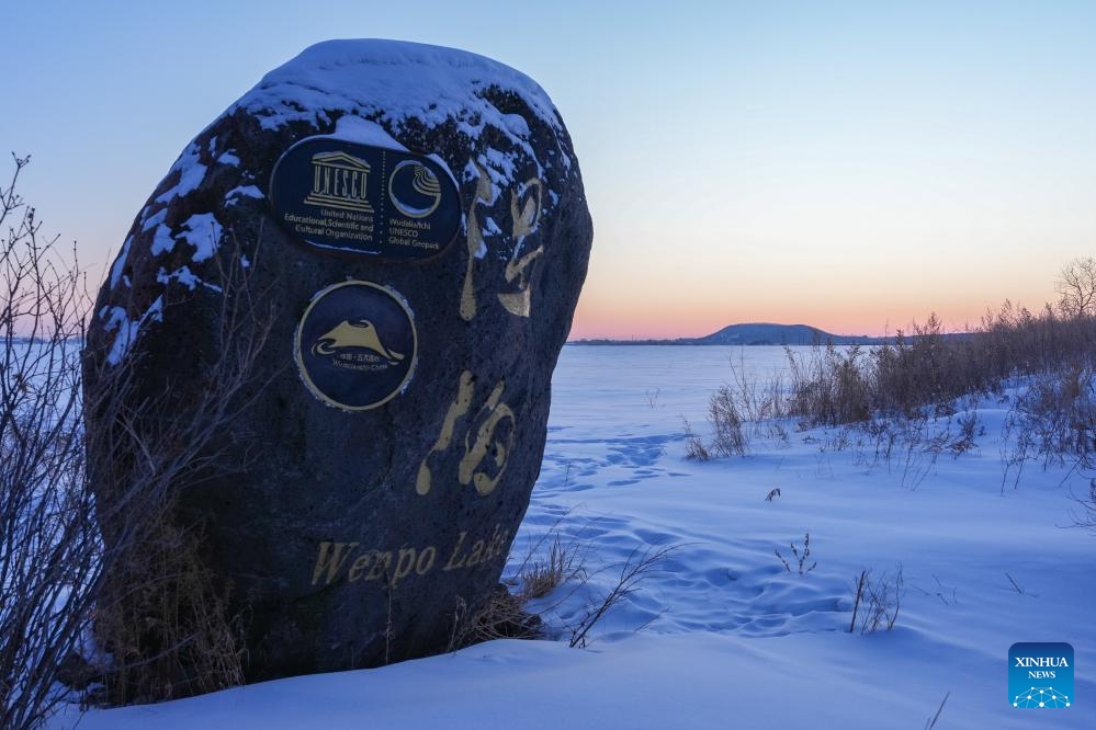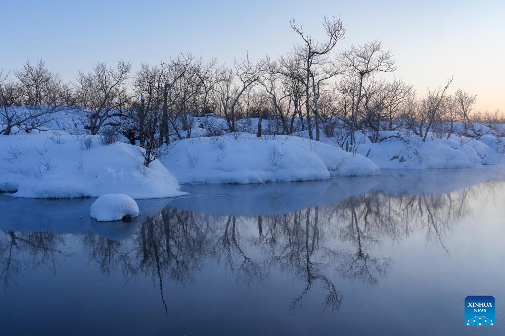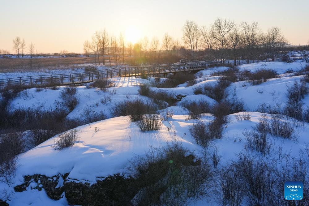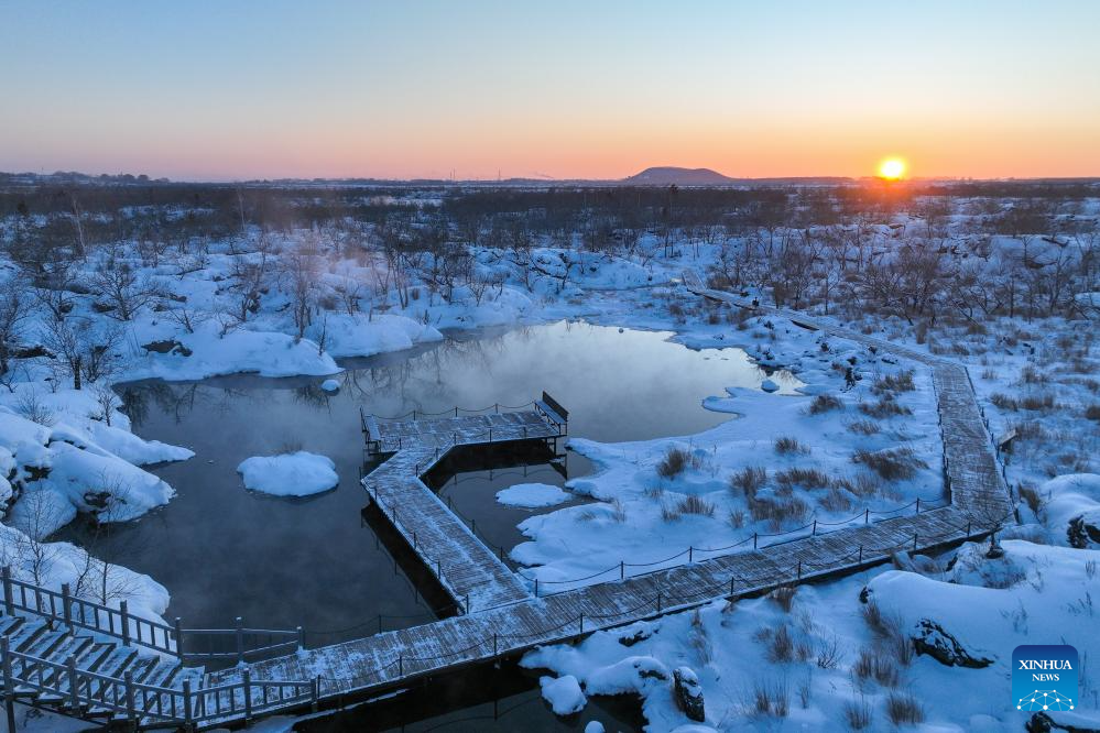 This photo taken on Jan. 29, 2024 shows a snow scenery of the Wudalianchi Geopark in Heihe, northeast China's Heilongjiang Province. The Wudalianchi Geopark features 14 volcanoes and five major volcanic barrier lakes. The geopark boasts a complete set of volcanic landforms, making it a natural volcano museum. (Xinhua/Xie Jianfei)