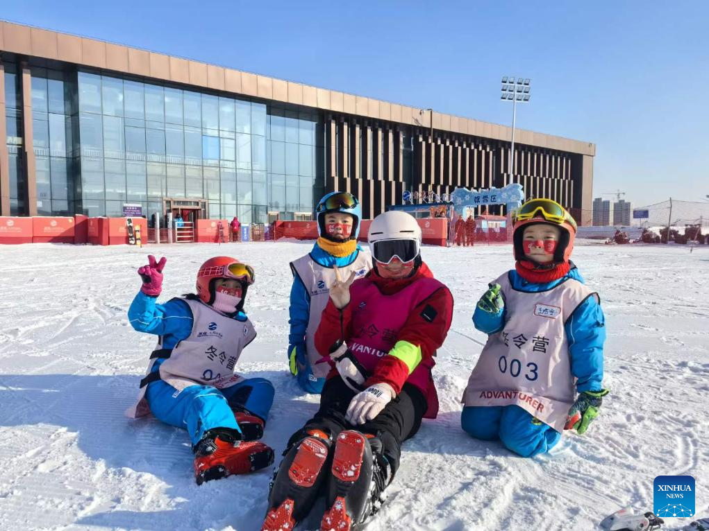 Coach Gao Rui (2nd R) and her students pose for photos at a winter camp in Datong, north China's Shanxi Province, Dec. 23, 2023. (Xinhua)