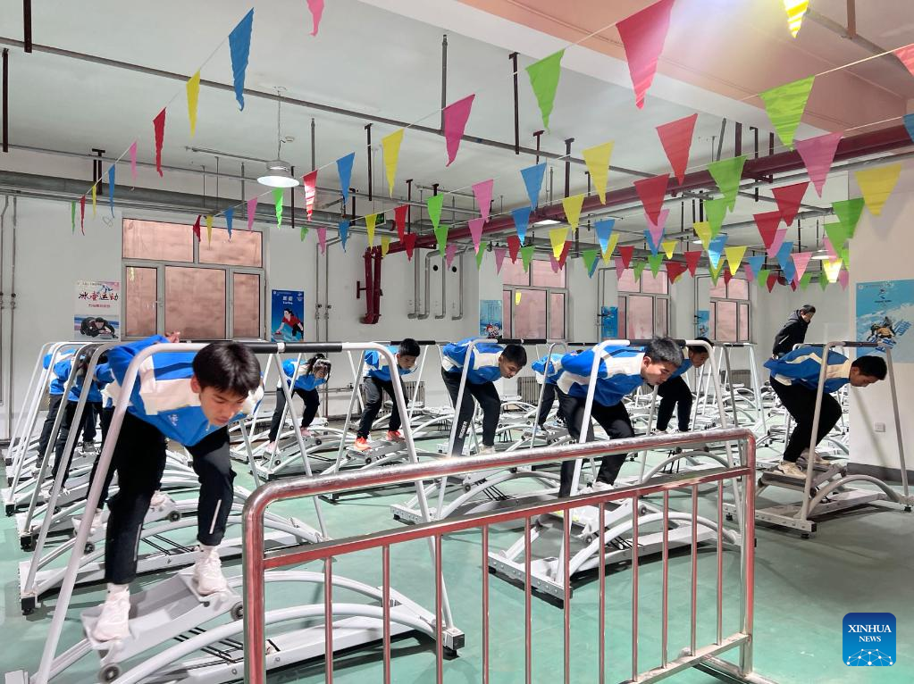 Speed skating team members of the Datong Foreign Languages School are pictured during their training in Datong, north China's Shanxi Province, Nov. 28, 2023. (Xinhua)