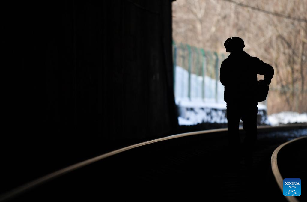 A staff member (L) of China Railway Xi'an Group Co., Ltd. examines the tracks on the Baoji-Chengdu Railway in Baoji City, northwest China's Shaanxi Province, on Jan. 28, 2024. (Xinhua/Zhang Bowen)
