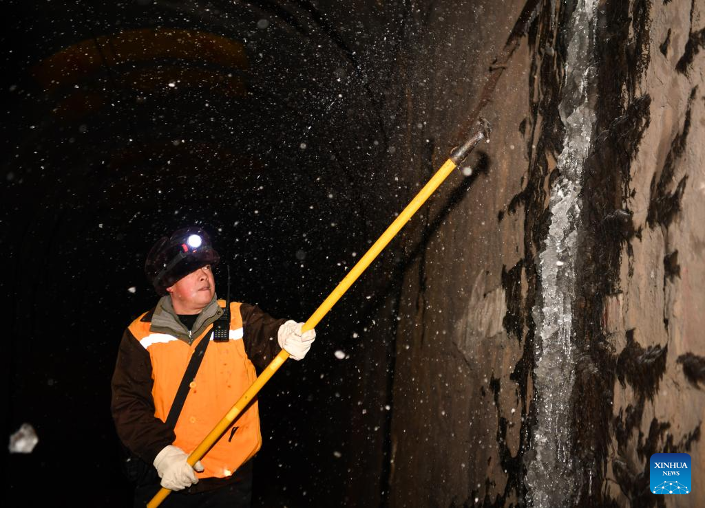 A staff member of China Railway Xi'an Group Co., Ltd. cleans the ice in a tunnel on the Baoji-Chengdu Railway in Baoji City, northwest China's Shaanxi Province, on Jan. 28, 2024. (Xinhua/Zhang Bowen)
