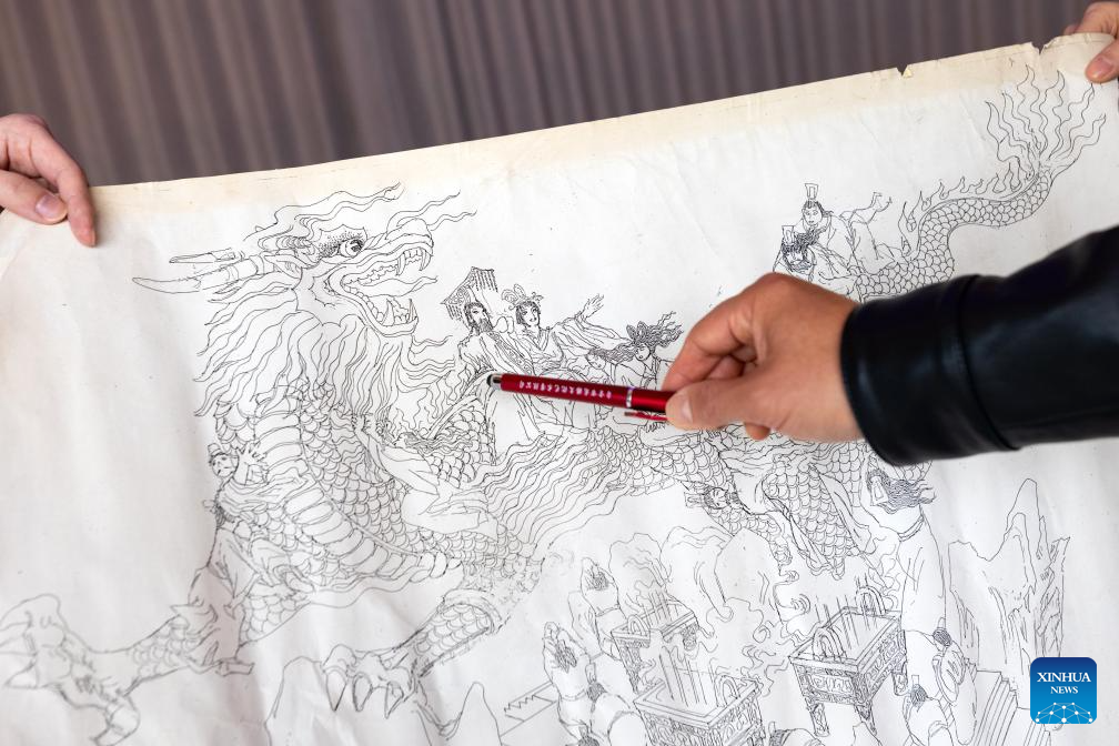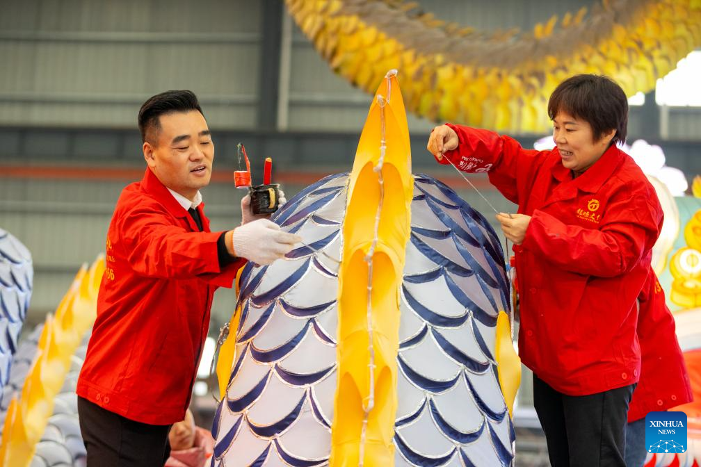 This photo taken on Jan. 29, 2024 shows a dragon-shaped lantern made by Deng Peilin's team for the upcoming Spring Festival in Guangzhou, south China's Guangdong Province. (Xinhua)