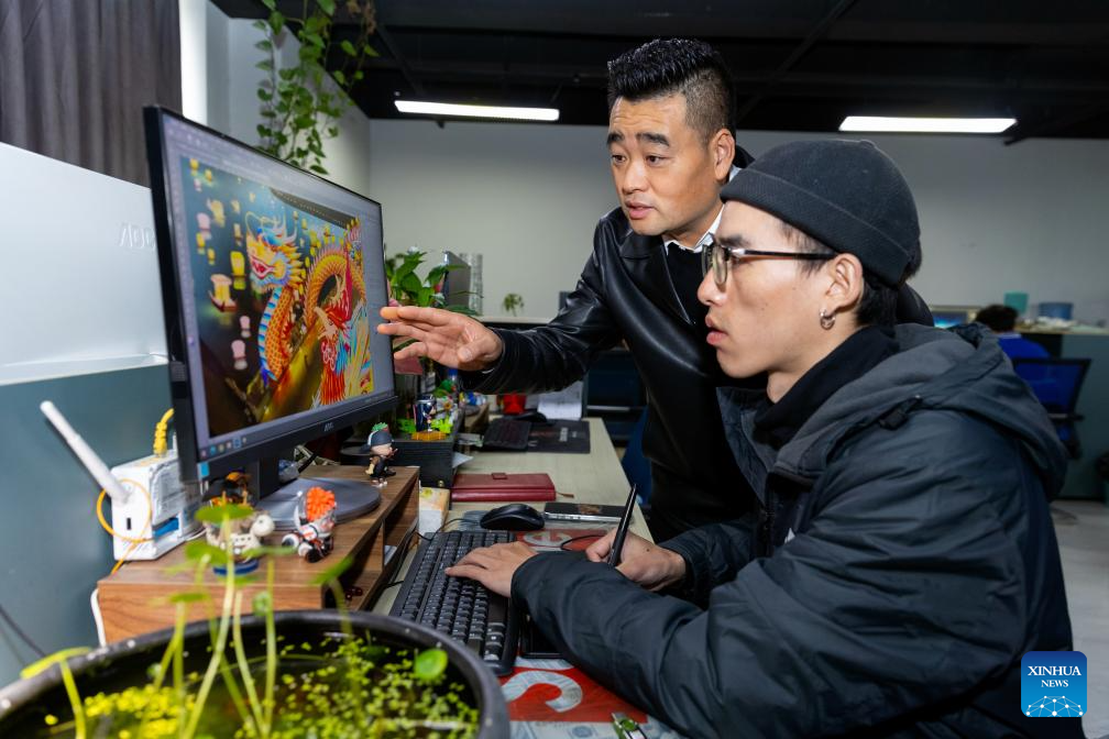 Deng Peilin (L) discusses the details of lanterns with a designer in Zigong City, southwest China's Sichuan Province, Jan. 19, 2024. (Xinhua/Shen Bohan)