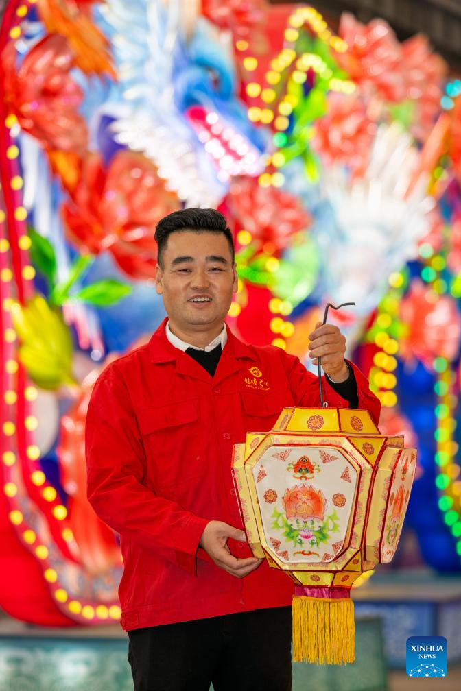 Deng Peilin poses with a traditional Zigong lantern in Zigong City, southwest China's Sichuan Province, Jan. 19, 2024. (Xinhua/Shen Bohan)