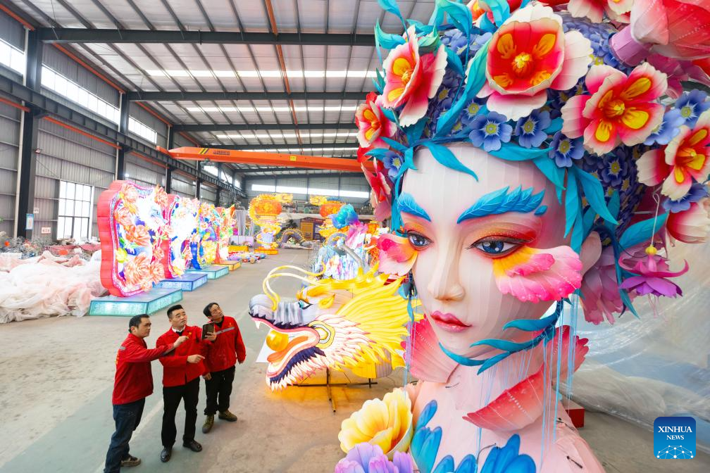 Deng Peilin (C) checks the details of a huge lantern with workers in Zigong City, southwest China's Sichuan Province, Jan. 19, 2024. (Xinhua/Shen Bohan)