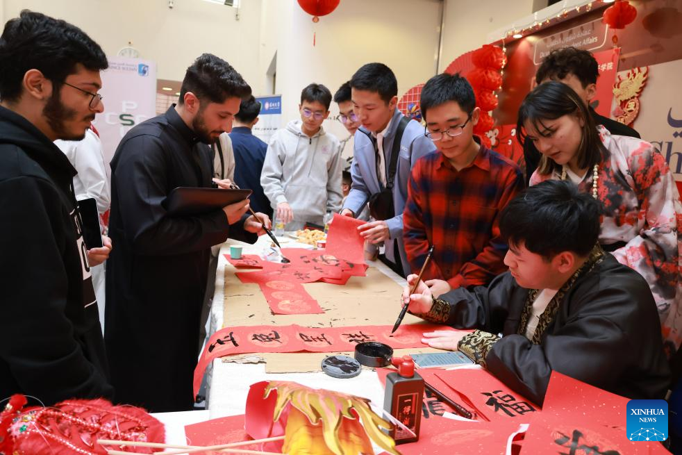 Students learn about Chinese calligraphy during a Chinese cultural event at the Confucius Institute of the Prince Sultan University in Riyadh, Saudi Arabia, Jan. 29, 2024. (Xinhua/Wang Haizhou)