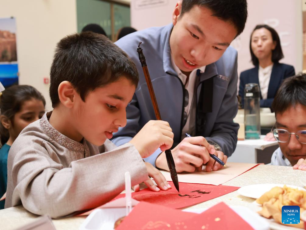 A boy tries his hands on Chinese calligraphy during a Chinese cultural event at the Confucius Institute of the Prince Sultan University in Riyadh, Saudi Arabia, Jan. 29, 2024. (Xinhua/Wang Haizhou)