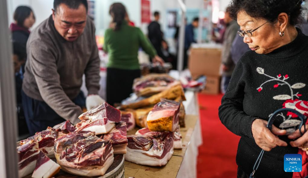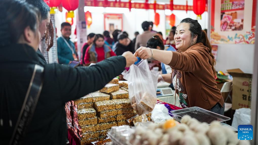 A citizen selects products during a fair in preparation for the upcoming Spring Festival in Guiyang, southwest China's Guizhou Province, Jan. 30, 2024. As the Spring Festival approaches, special fairs with bountiful supplies are staged in different localities across the province to ensure one-stop shopping experience for the residents. (Xinhua/Tao Liang)