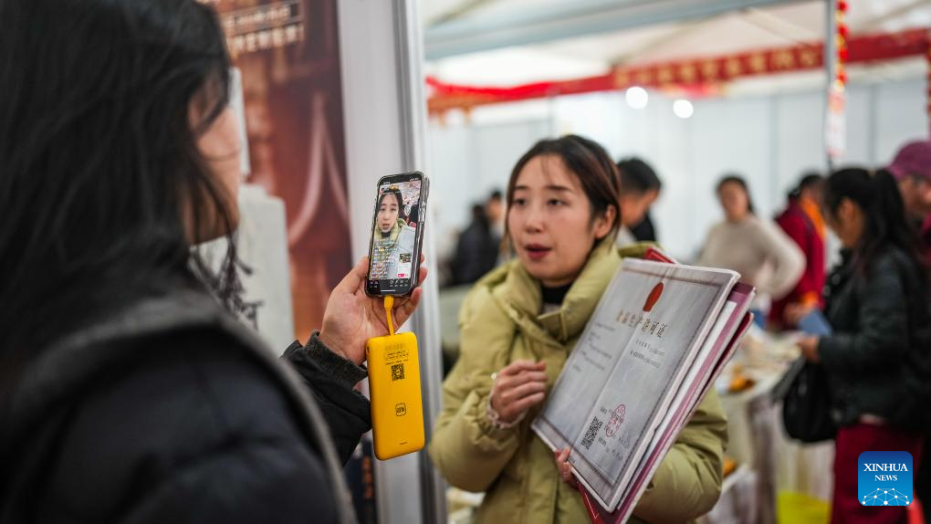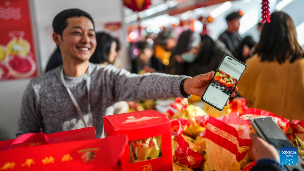 A merchant sells products via livestreaming during a fair in preparation for the upcoming Spring Festival in Guiyang, southwest China's Guizhou Province, Jan. 30, 2024. As the Spring Festival approaches, special fairs with bountiful supplies are staged in different localities across the province to ensure one-stop shopping experience for the residents. (Xinhua/Tao Liang)