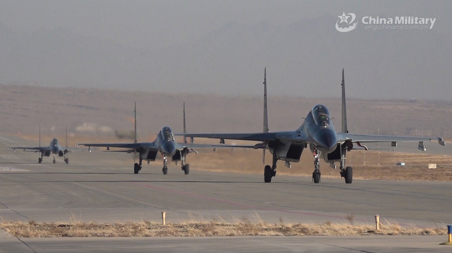 Fighter jets attached to an aviation brigade of the air force under the PLA Western Theater Command taxi in formation to get in position for takeoff during a flight training exercise on January 4, 2024. (eng.chinamil.com.cn/Photo by Yu Zeqi)