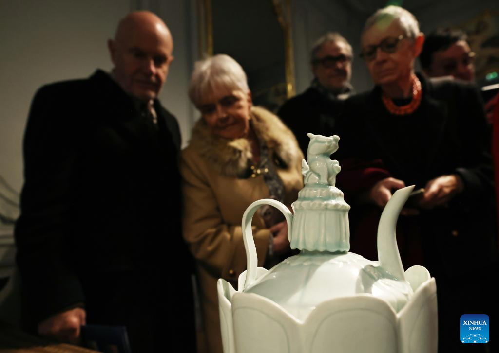 People visit an exhibition of porcelain artworks from Jingdezhen of China, in Paris, France, Jan. 30, 2024. The exhibition kicked off here on Tuesday with 48 porcelain artworks on display. (Xinhua/Gao Jing)