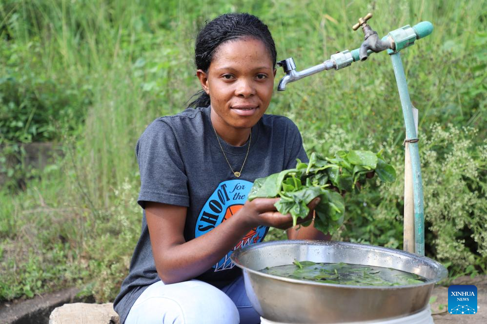 A resident washes vegetables with water provided by the Arusha new water supply system project undertaken by Power Construction Corporation of China, in Arusha, Tanzania, on Jan. 28, 2024. The water supply project includes laying over 620 km of steel pipelines, constructing 11 pools and connecting the water supply pipeline network to 48,000 households, according to PowerChina. (Xinhua/Hua Hongli)