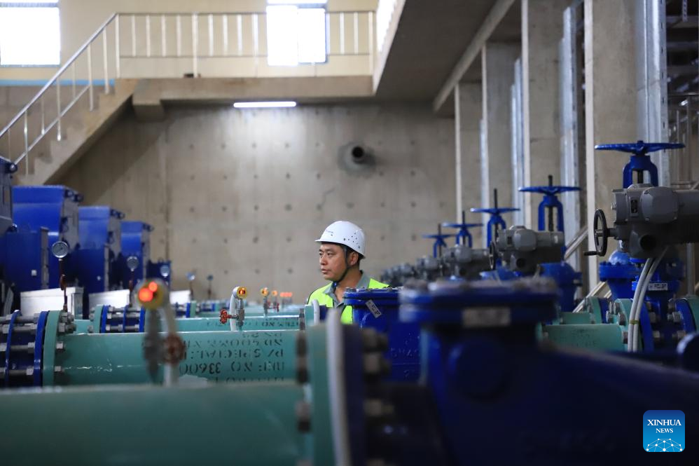 Jin Denghui, project manager of the Arusha new water supply system project, inspects a pump station of the project undertaken by Power Construction Corporation of China, in Arusha, Tanzania, on Jan. 28, 2024. The water supply project includes laying over 620 km of steel pipelines, constructing 11 pools and connecting the water supply pipeline network to 48,000 households, according to PowerChina. (Xinhua/Hua Hongli)