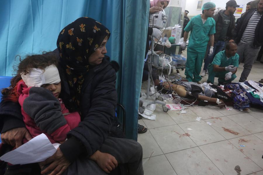 A child receives treatment at a temporary hospital in the southern Gaza Strip city of Rafah, on Jan. 25, 2024. Nearly 1.5 million people are now crammed inside Rafah governorate. Disease is spreading as the health system collapses. Only 16 of Gaza's 36 hospitals are even partly functional. That means the people of Gaza not only risk being killed or injured by relentless bombardments, they also run a growing chance of contracting infectious diseases, UN Secretary-General Antonio Guterres said on Tuesday. (Photo by Rizek Abdeljawad/Xinhua)