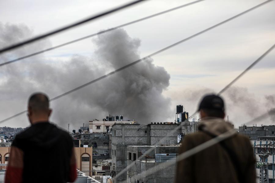 Smoke rises following an Israeli airstrike in the southern Gaza Strip city of Khan Younis, on Jan. 21, 2024. (Photo by Yasser Qudih/Xinhua)