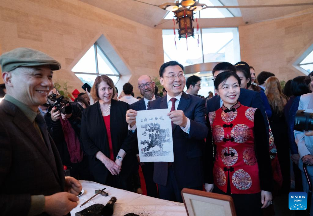 Chinese Ambassador to the United States Xie Feng (C) displays a woodblock print at an event celebrating the 45th anniversary of China-U.S. student exchanges and the Spring Festival Gala for Chinese and American youths at the Chinese Embassy in Washington, D.C., the United States, Jan. 28, 2024. (Xinhua/Liu Jie)