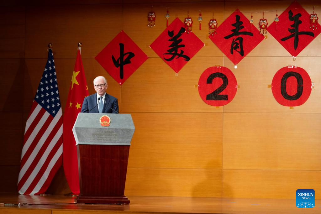 Allan Goodman, the CEO of the Institute of International Education, speaks during an event celebrating the 45th anniversary of China-U.S. student exchanges and the Spring Festival Gala for Chinese and American youths at the Chinese Embassy in Washington, D.C., the United States, Jan. 28, 2024. (Xinhua/Liu Jie)