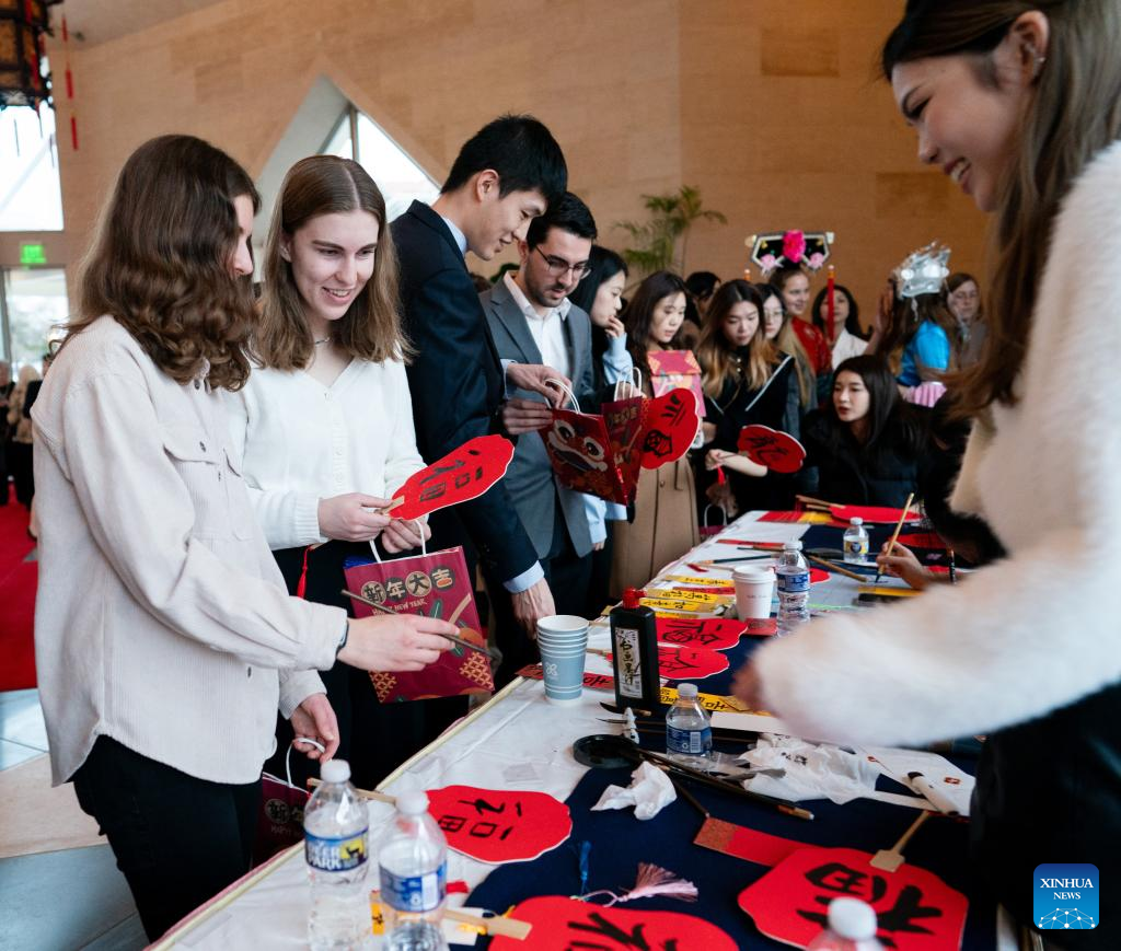 Guests learn to write Chinese calligraphy at an event celebrating the 45th anniversary of China-U.S. student exchanges and the Spring Festival Gala for Chinese and American youths at the Chinese Embassy in Washington, D.C., the United States, Jan. 28, 2024. (Xinhua/Liu Jie)