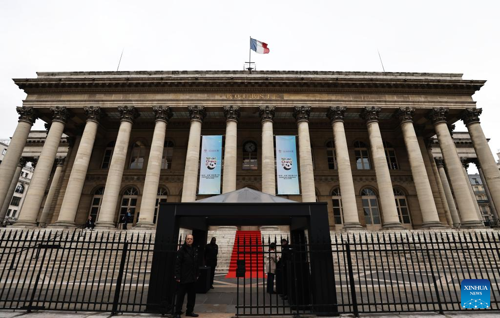 Posters of a tourism promotion event named "Nihao! China" are seen outside the Paris Brongniart in Paris, France, Jan. 30, 2024. (Xinhua/Gao Jing)