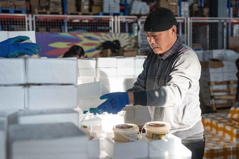 A staff member packages Russian honey in the Heihe Area of China (Heilongjiang) Pilot Free Trade Zone in Heihe, northeast China's Heilongjiang Province, Jan. 31, 2024. (Xinhua/Xie Jianfei)