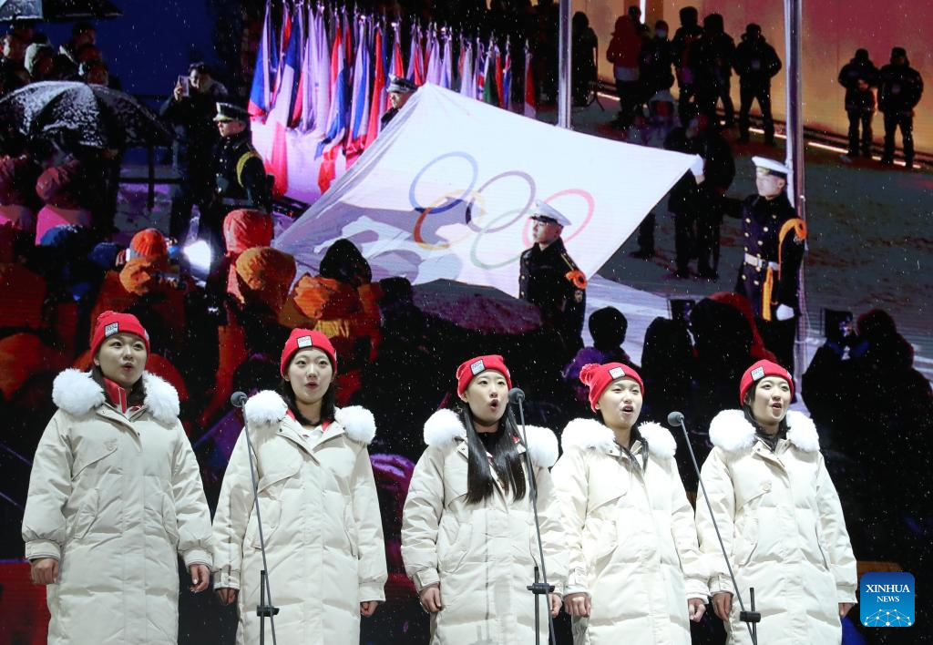 A choir sing while the Olympic flag is lowered during the closing ceremony of Gangwon 2024 Winter Youth Olympic Games in Gangneung, Korea, Feb. 1, 2024. (Xinhua/Yao Qilin)