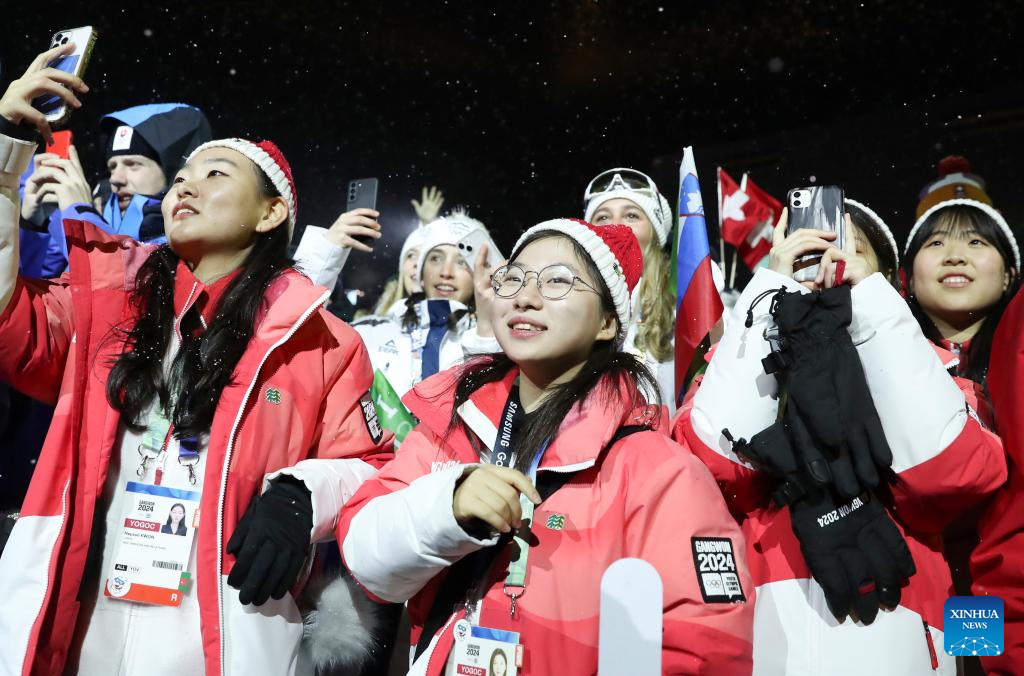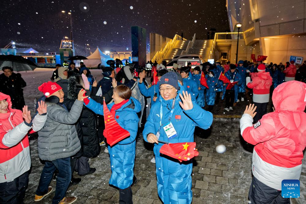Members of the Chinese delegation enter the site before the closing ceremony of Gangwon 2024 Winter Youth Olympic Games in Gangneung, Korea, Feb. 1, 2024. (Xinhua/Zhang Xiaoyu)