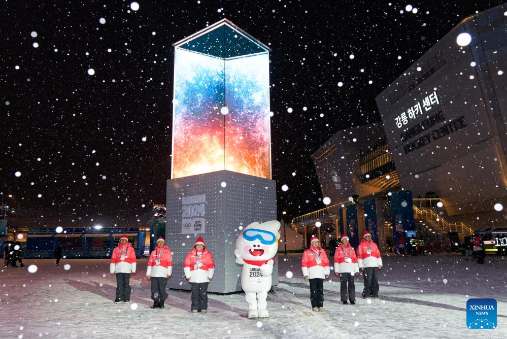 The mascot Moongcho (C) and volunteers prepare to put out the digital cauldron at Gangneung Olympic Park during the closing ceremony of Gangwon 2024 Winter Youth Olympic Games in Gangneung, Korea, Feb. 1, 2024. (Xinhua/Zhang Xiaoyu)