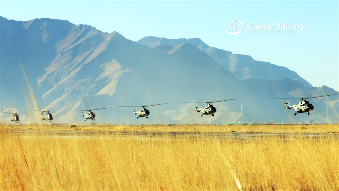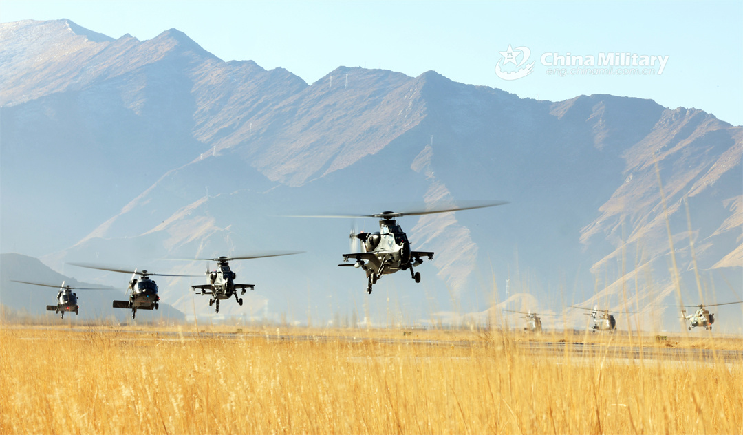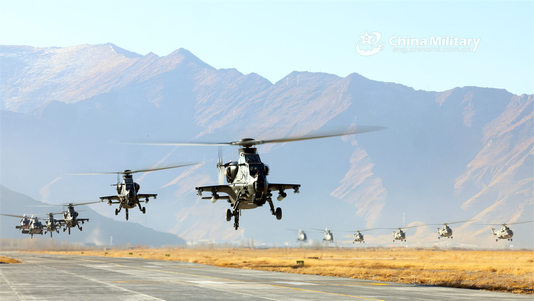 Multiple attack and transport helicopters attached to an army aviation brigade under the PLA Xizang Military Command lift off for a flight training exercise on January 12, 2024. (eng.chinamil.com.cn/Photo by Hu Qiwu)
