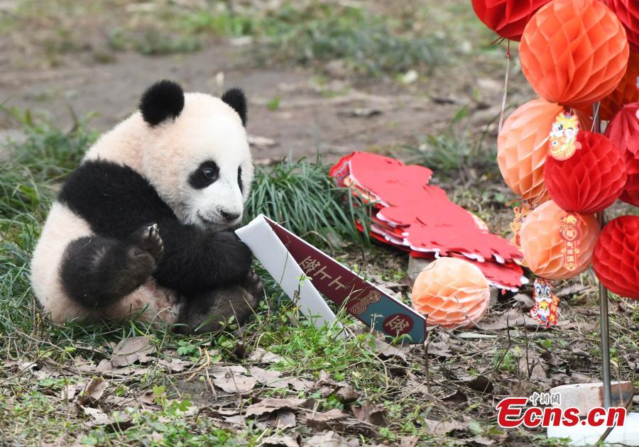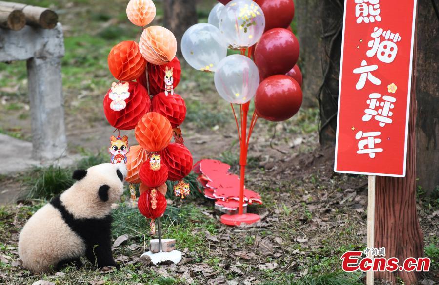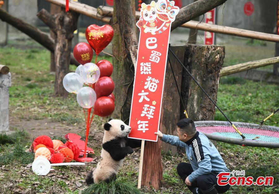 A giant panda cub plays during a celebration event for the upcoming Spring Festival at the Chongqing Zoo, Feb. 2, 2024. (Photo: China News Service/Zhou Yi)