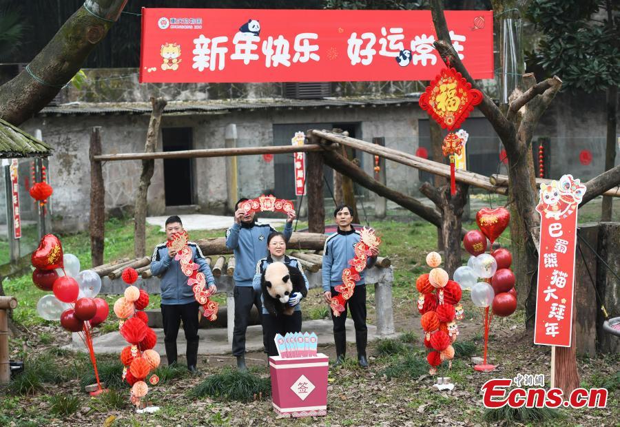 Keepers hold giant panda cubs during a celebration event for the upcoming Spring Festival at the Chongqing Zoo, Feb. 2, 2024. (Photo: China News Service/Zhou Yi)