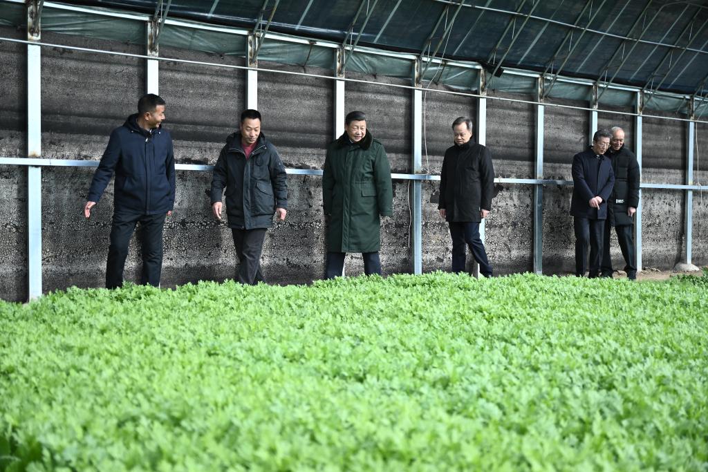 Chinese President Xi Jinping, also general secretary of the Communist Party of China Central Committee and chairman of the Central Military Commission, walks into a greenhouse to check the growth of vegetables when learning about the recovery of farming activities after last year's floods in a village of Xinkou Town in Xiqing District of north China's Tianjin Municipality, Feb. 1, 2024. Xi visited people in the northern city of Tianjin ahead of the Spring Festival and made an inspection tour in Tianjin from Thursday to Friday. (Xinhua/Yan Yan)