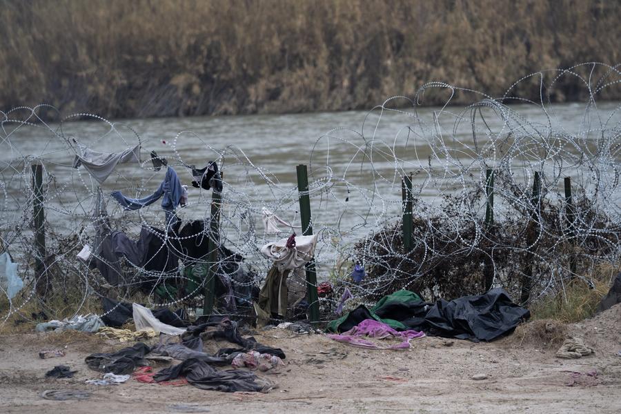 Clothing on the razor wire barriers are seen at the U.S.-Mexico border in Eagle Pass, Texas, the United States, Feb. 2, 2024. (Xinhua/Liu Jie)