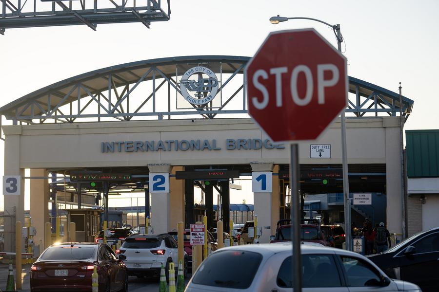 Vehicles cross the International Bridge to leave the United States at the U.S.-Mexico border, in Eagle Pass, Texas, the United States, Feb. 1, 2024. (Xinhua/Liu Jie)