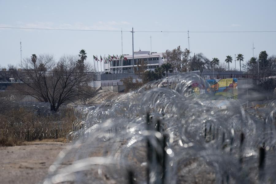 Razor wire barriers are seen at the U.S.-Mexico border on the U.S. side bank of the Rio Grande in Eagle Pass, Texas, the United States, Feb. 1, 2024. (Xinhua/Liu Jie)