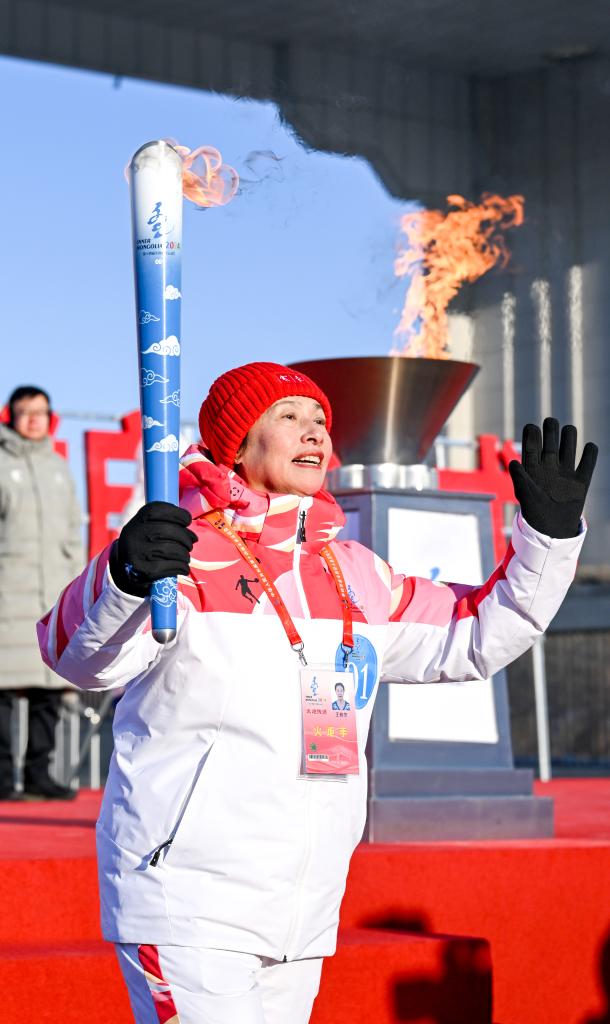 Torch bearer Meng Fanying takes part in the torch relay of China's 14th National Winter Games in Hulun Buir, north China's Inner Mongolia Autonomous Region, Feb. 3, 2024. (Photo by Kang Wenkui/Xinhua)