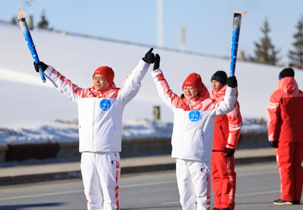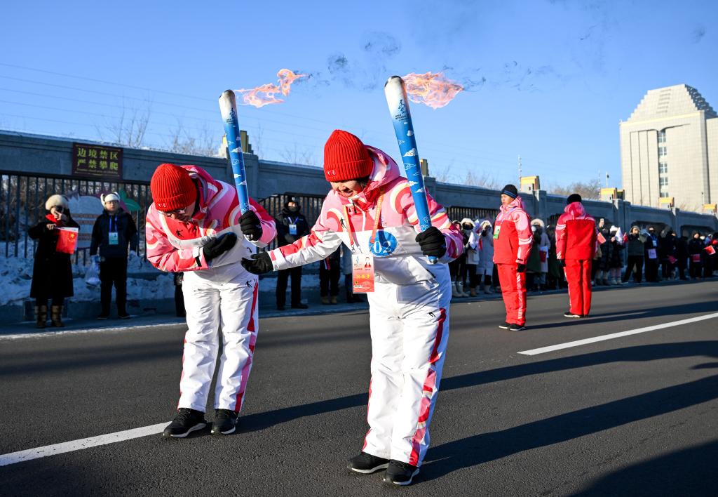 Torch bearers Bao Lingling (R) and Qian Zhuo take part in the torch relay of China's 14th National Winter Games in Hulun Buir, north China's Inner Mongolia Autonomous Region, Feb. 3, 2024. (Xinhua/Lian Zhen)