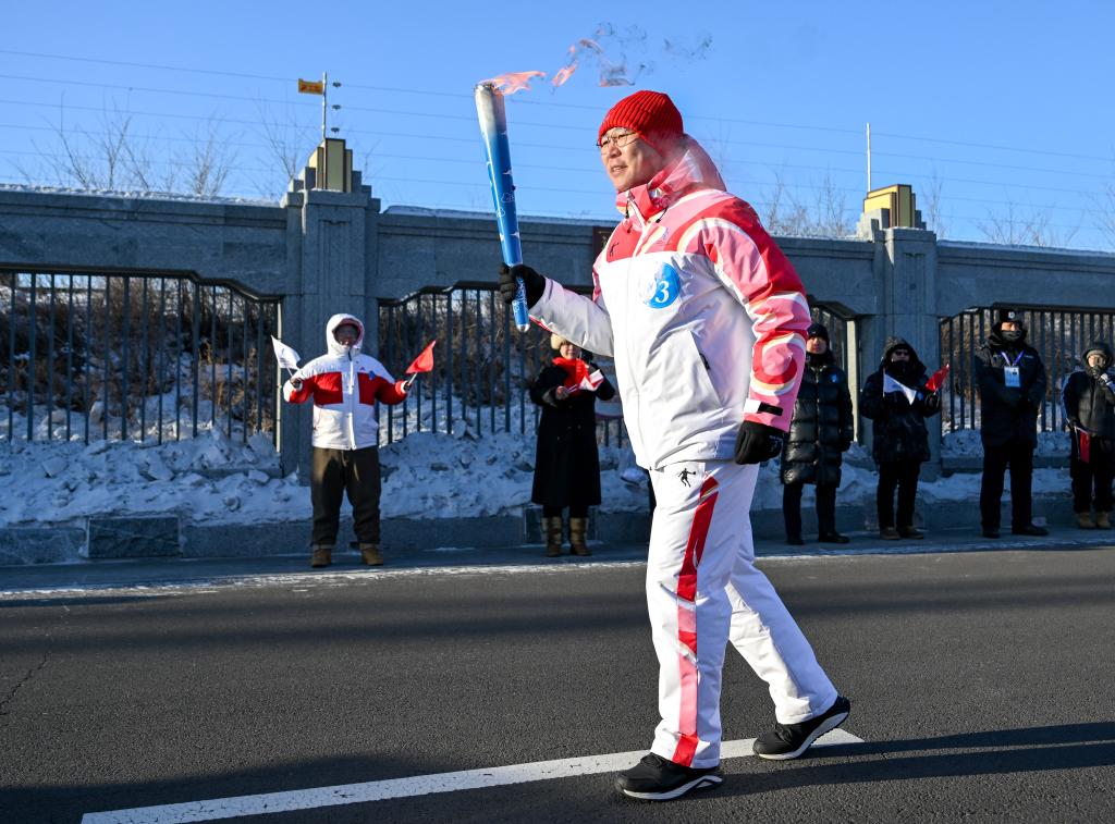 Torch bearer Song Guixu takes part in the torch relay of China's 14th National Winter Games in Hulun Buir, north China's Inner Mongolia Autonomous Region, Feb. 3, 2024. (Photo by Kang Wenkui/Xinhua)