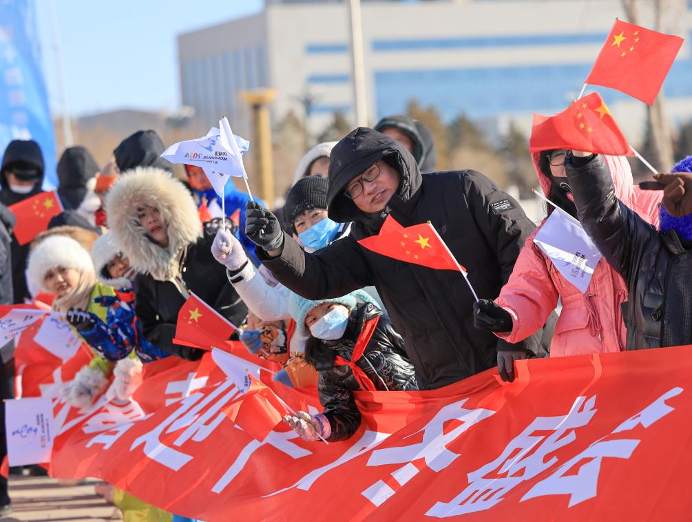 People cheer for torch bearers during the torch relay of China's 14th National Winter Games in Hulun Buir, north China's Inner Mongolia Autonomous Region, Feb. 3, 2024. (Photo by Kang Wenkui/Xinhua)