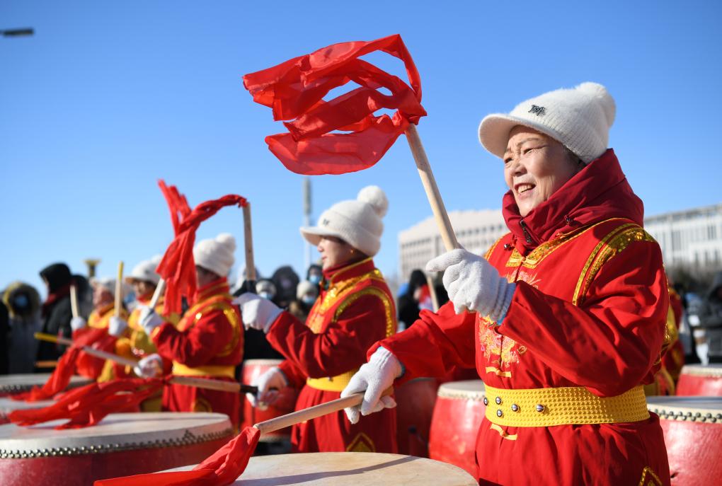 Actors perform during the torch relay of China's 14th National Winter Games in Hulun Buir, north China's Inner Mongolia Autonomous Region, Feb. 3, 2024. (Photo by Kang Wenkui/Xinhua)