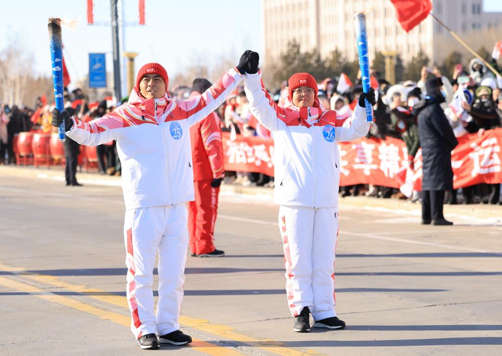 Torch bearers Song Yuhuan (R) and Jing Xiaotao take part in the torch relay of China's 14th National Winter Games in Hulun Buir, north China's Inner Mongolia Autonomous Region, Feb. 3, 2024. (Photo by Kang Wenkui/Xinhua)