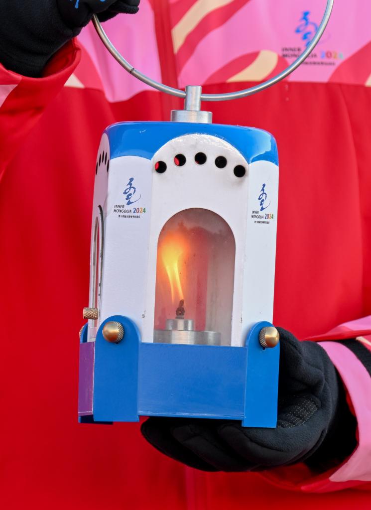 The flame is seen during the flame retrieval ceremony at the torch relay of China's 14th National Winter Games in Hulun Buir, north China's Inner Mongolia Autonomous Region, Feb. 3, 2024. (Xinhua/Lian Zhen)
