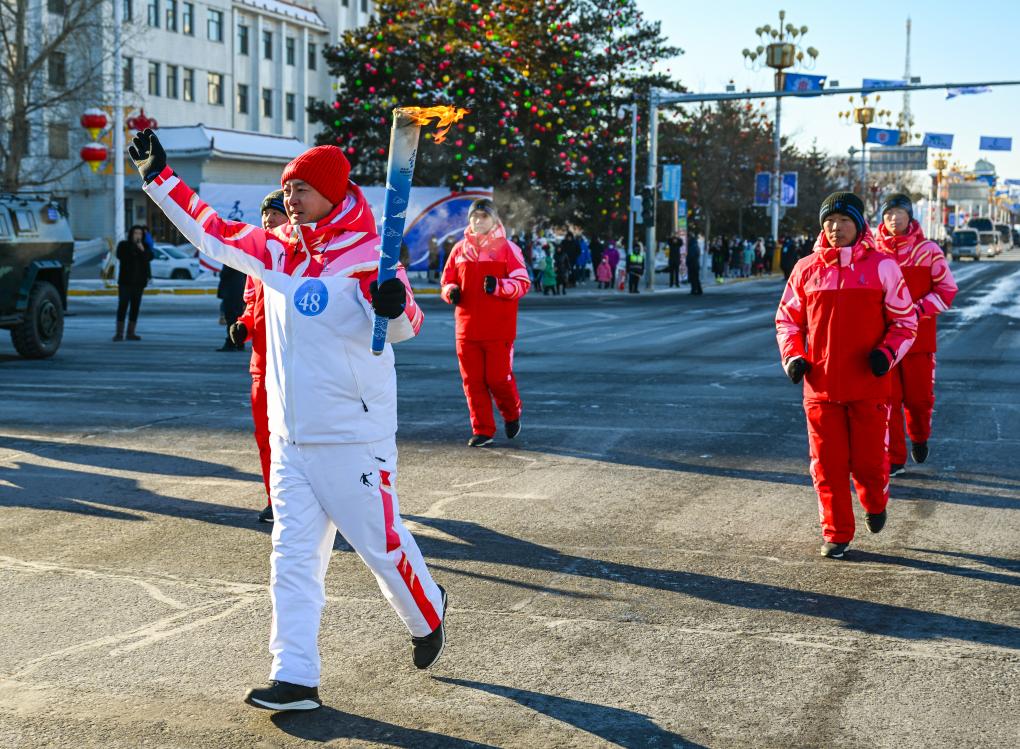 Torch Bearer Zheng Lu takes part in the torch relay of China's 14th National Winter Games in Hulun Buir, north China's Inner Mongolia Autonomous Region, Feb. 3, 2024. (Xinhua/Peng Yuan)