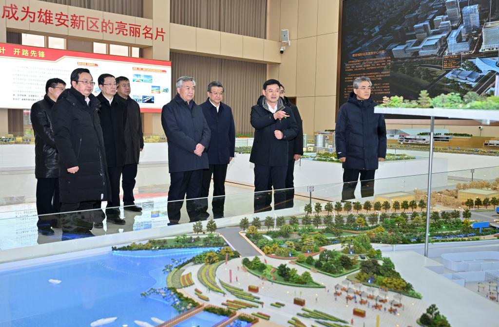 Li Xi, a member of the Standing Committee of the Political Bureau of the Communist Party of China (CPC) Central Committee and secretary of the CPC Central Commission for Discipline Inspection (CCDI), inspects the command center of an inter-city railway station in Xiong'an New Area, north China's Hebei Province, Feb. 1, 2024. Li made an inspection tour in north China's Hebei Province from Thursday to Saturday. (Xinhua/Yue Yuewei)