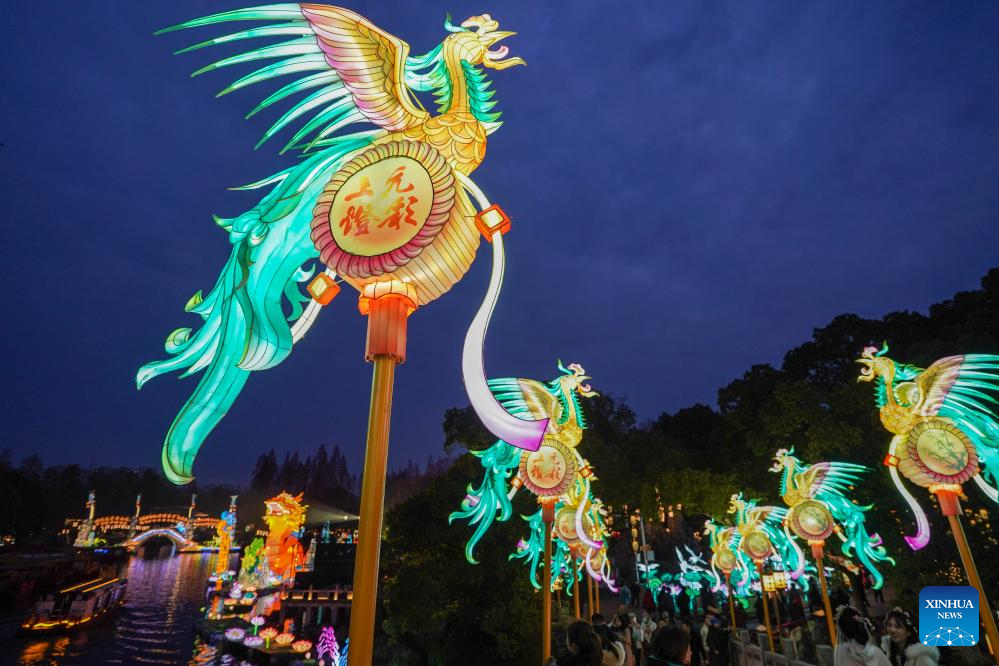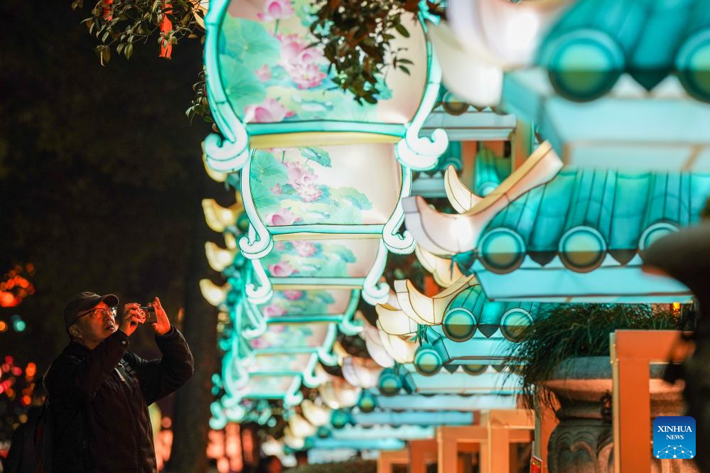 This photo taken on Jan. 29, 2024 shows festive lanterns at Bailuzhou park in Nanjing, east China's Jiangsu Province. About 330 sets of festive lanterns will decorate seven urban areas of Nanjing during the upcoming Chinese New Year. (Xinhua/Li Bo)