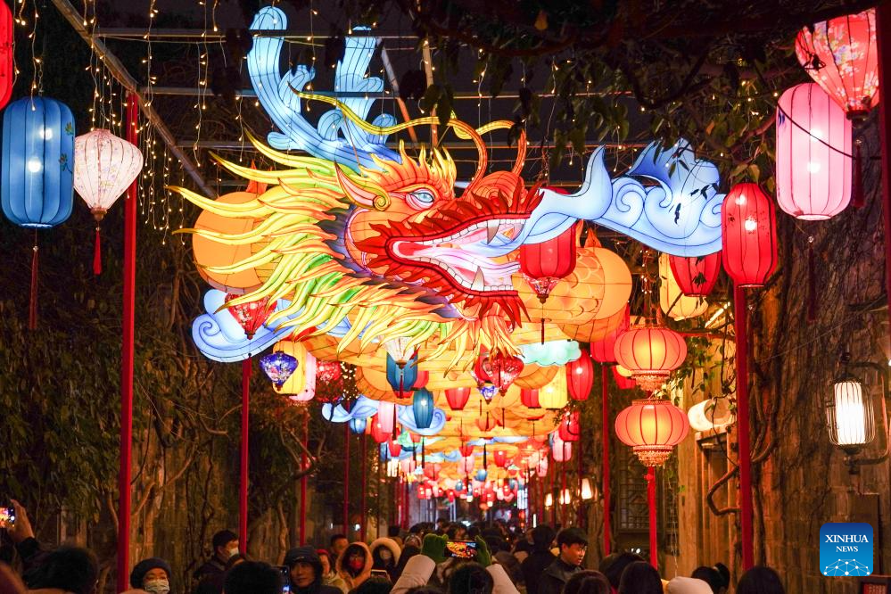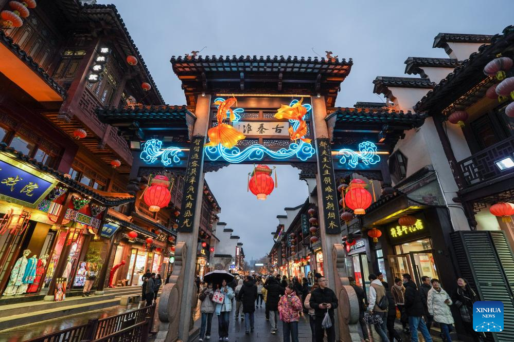 People visit the Fuzi (Confucius) Temple scenic area in Nanjing, east China's Jiangsu Province, Feb. 1, 2024. About 330 sets of festive lanterns will decorate seven urban areas of Nanjing during the upcoming Chinese New Year. (Xinhua/Li Bo)