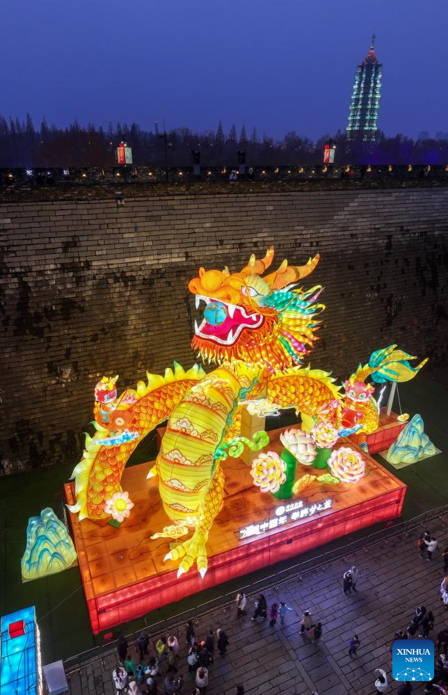 An aerial drone photo taken on Jan. 21, 2024 shows a dragon-shaped festive lantern at the Laomendong scenic area in Nanjing, east China's Jiangsu Province. About 330 sets of festive lanterns will decorate seven urban areas of Nanjing during the upcoming Chinese New Year. (Xinhua/Li Bo)