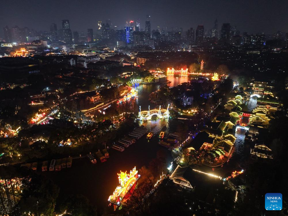 An aerial drone photo taken on Jan. 29, 2024 shows festive lanterns at Bailuzhou park in Nanjing, east China's Jiangsu Province. About 330 sets of festive lanterns will decorate seven urban areas of Nanjing during the upcoming Chinese New Year. (Xinhua/Li Bo)