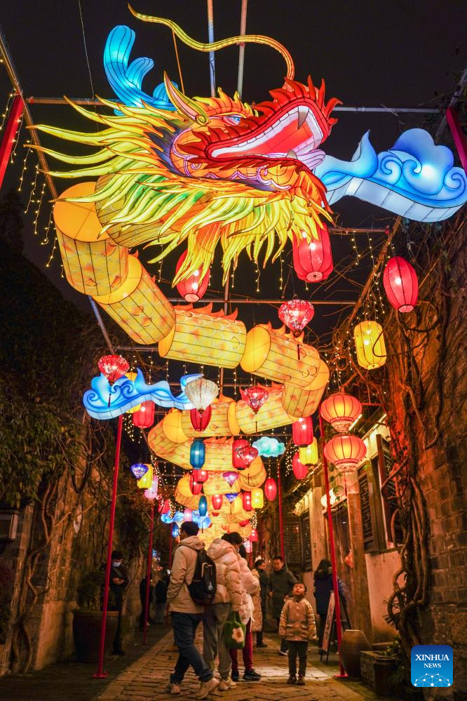 This photo taken on Jan. 21, 2024 shows a dragon-shaped festive lantern at the Laomendong scenic area in Nanjing, east China's Jiangsu Province. About 330 sets of festive lanterns will decorate seven urban areas of Nanjing during the upcoming Chinese New Year. (Xinhua/Li Bo)
